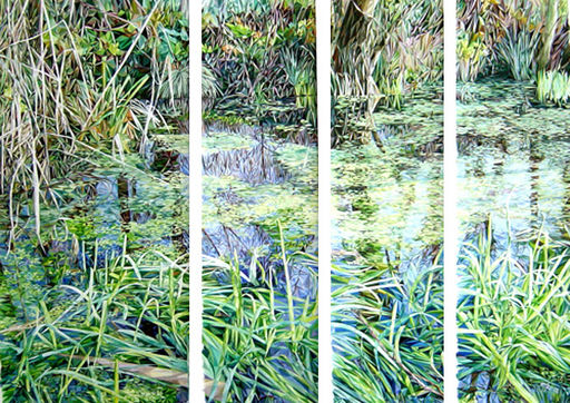 Her curious style in most of her works is the structure of many small triangles. This distinct style makes her stand out the regular and well know classic aquarel style
